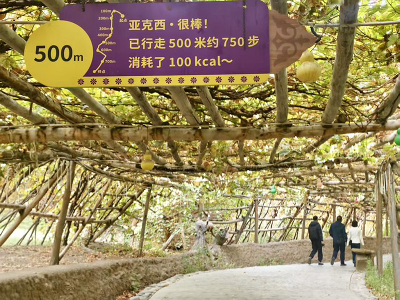 十月中旬的葡萄溝,雖剛過旅游旺季,卻依舊生機盎然。幾公里長的葡萄架上,還掛著不少已自然風干的干葡萄。清澈的天山雪水在溝渠中潺潺流淌,正是這得天獨厚的水資源,讓葡萄溝成為栽種葡萄的絕佳之地。沿著葡萄長廊漫步,抬眼所見的“亞克西,很棒!已行走500米”激勵木牌讓人溫暖。從2025年5月1日起,葡萄溝景區取消了門票,以“零門檻”惠民政策,向游客敞開深度體驗吐魯番文化的大門。?