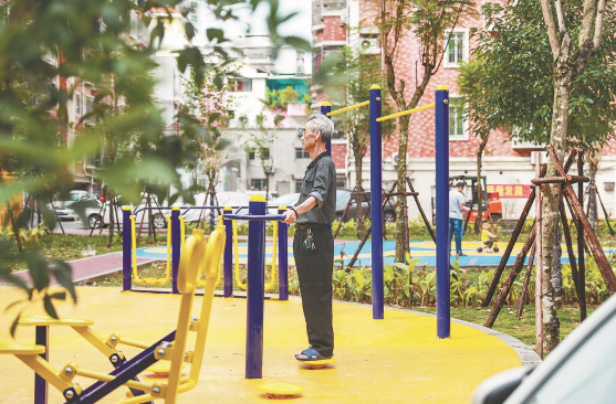 經過精細化改造后煥然一新,成為集兒童游樂、體育健身、休閑漫步于一體的社區小公園,昔日“臟亂差”的角落如今充滿市民的歡聲笑語,成為城市微更新項目的又一成功范例。色彩明快的塑膠地墊取代了曾經的碎石黃土,嶄新的兒童游樂區內,排列著滑梯等娛樂設施。