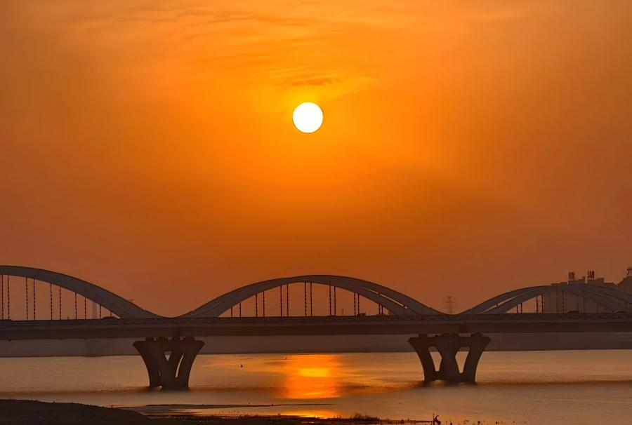 2025年10月23日,日出時分的博河大橋遠遠望去像一條吉祥的哈達。新華網記者李雪芹 攝