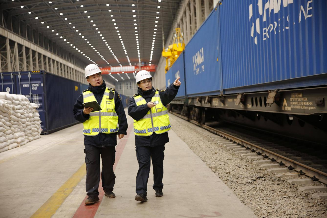 2025年11月1日,阿拉山口海關關員在對入境中歐班列開展監管工作。新華網發 潘嘉陽 攝