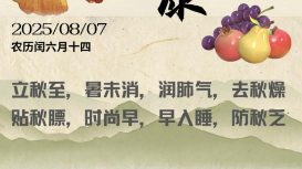 "今日立秋2025年8月7日農歷:閏六月十四 立秋至,暑未消,潤肺氣,去秋燥。"