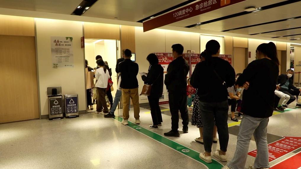 11月1日晚上7點,記者來到河南省人民醫院急診部,在兒科急診室門口,二十多位帶著孩子的家長已經排起了長隊,等待看診。