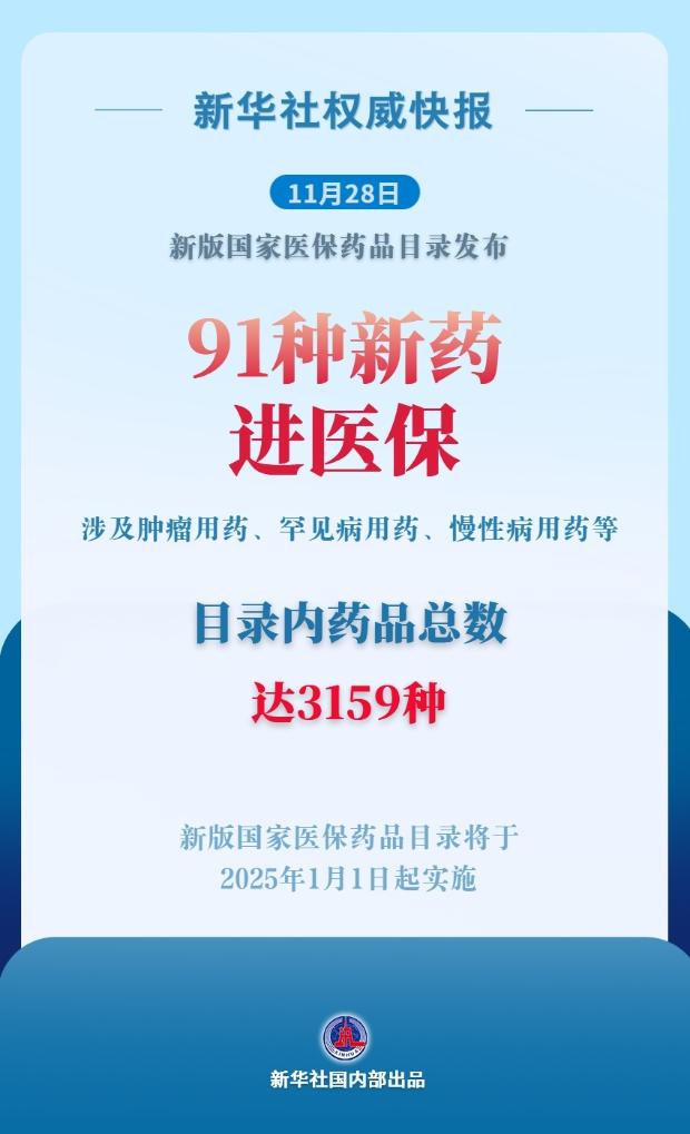 自成立以來,國家醫保局已連續7年開展醫保藥品目錄調整工作。本次調整后,目錄內藥品總數將增至3159種,腫瘤、慢性病、罕見病、兒童用藥等領域的保障水平得到提升。新版國家醫保藥品目錄將于2025年1月1日起實施。