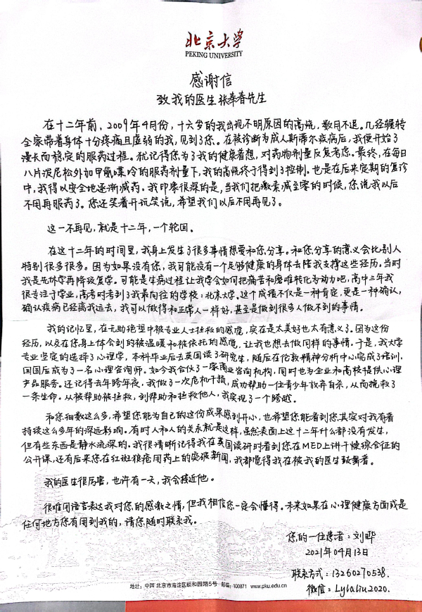 歷經12年輪回,曾經四處輾轉求醫的患者如今已經順利從北京大學畢業,并成為一名心理咨詢師。那個曾經被張奉春從死亡線上拉回來的患者,如今成為了挽救少年生命的“天使”