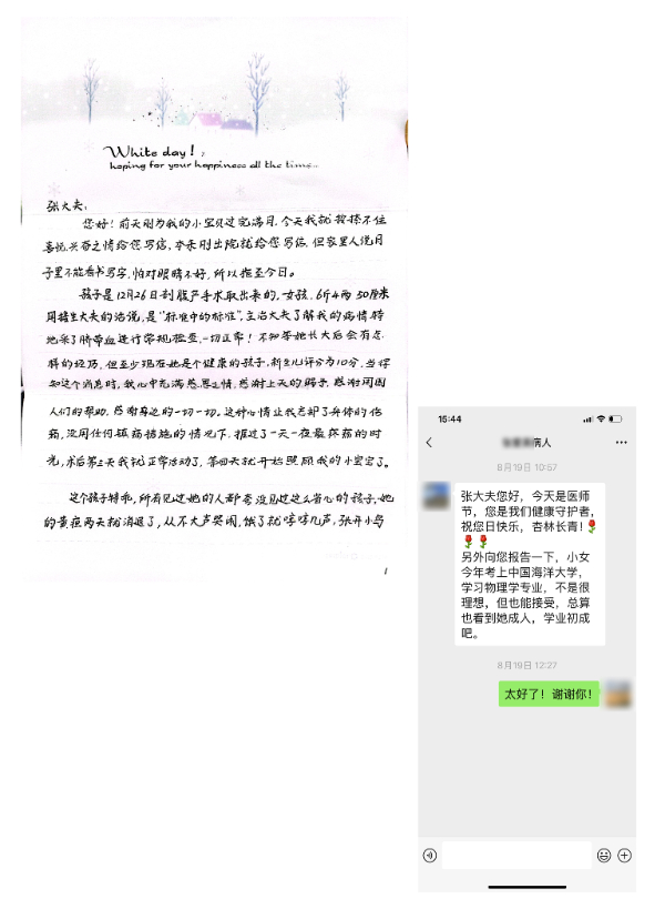 左上:河南的紅斑狼瘡患者生下健康寶寶后給張奉春的來信(部分節選);右下:曾經的寶寶今年順利考上大學,媽媽在醫師節之際給張奉春發來祝福