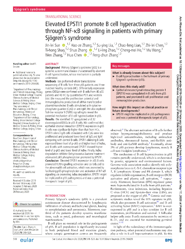 張奉春帶領團隊探究原發性干燥綜合征B細胞的基因表達譜,發現上皮基質相互作用蛋白1(EPSTI1)表達,并首次揭示該蛋白調控B細胞異?;罨臋C制。該成果發表于風濕病學頂尖雜志《風濕病學年鑒》(Annals of the Rheumatic Diseases)上
