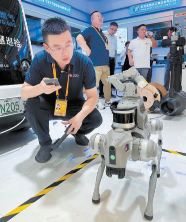 一會兒前進,一會兒后退,一會兒伸出爪子揮手賣萌……北京燃氣集團的展位上,后背上馱著伸縮機械臂的智能機器狗吸引了不少觀眾的注意?!斑@是我們專門為居民小區設計的燃氣巡檢智能機器狗,可24小時在小區內對燃氣安全進行循環巡視?!笔殖诌b控器的工作人員介紹,機器狗只需要在小區內“遛”一圈,就能立刻記住全部巡檢路線和每個巡檢點。抵達巡檢點后,機器狗后背上馱著的機械臂會立刻張開,對燃氣管線進行自動檢查。比如,當對燃氣閘井進行檢查時,機器狗會首先對井蓋是否破損、偏移進行檢查,隨后會轉動機械臂掃描閘井上的氣孔,通過機械臂上安裝的激光甲烷遙測儀對燃氣是否泄漏進行檢測。一旦發現燃氣泄漏,還會自動發布預警信息并實時上報?!拔覀冋趯C器狗進行系統更新,目前新一代產品已經具備防塵防水等功能,越障能力也大大增強?!惫ぷ魅藛T表示,待測試成熟后,機器狗即可進入居民小區上崗工作。