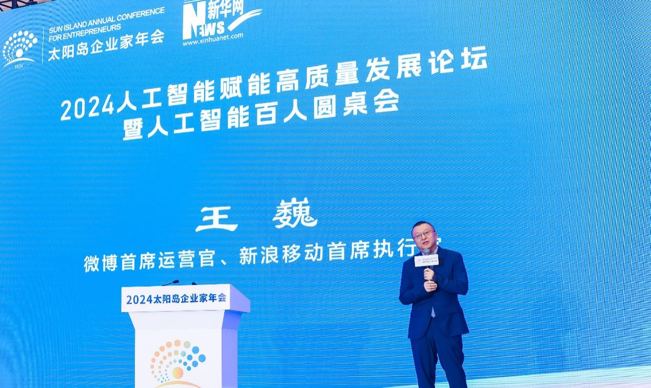 新華網北京8月26日電(趙海軍)8月22日-24日,2024太陽島企業家年會在哈爾濱舉行,來自政產學研用領域超千位嘉賓出席大會,并聚焦新質生產力展開了深入的交流與思想碰撞。微博COO、新浪移動CEO王巍出席,并在人工智能賦能高質量發展論壇暨人工智能百人圓桌會上發表了主題為《大模型崛起——人工智能+賦能企業高質量發展》的演講,分享了人工智能賦能企業高質量發展中的引擎作用。