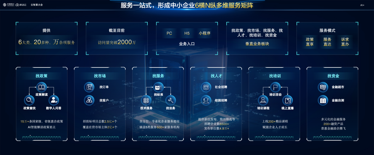 中國移動深度參與國家中小企業數字化賦能專項行動,在工信部的指導下,承建了中國中小企業服務網,廣泛匯聚各類服務資源,實現找政策、找市場、找服務、找人才、找培訓、找資金、匯辦事等功能板塊和企業八大自測服務,現已成為面向中小企業政策匯聚與服務支撐的核心樞紐。平臺已累計匯聚15.5萬條省部級政策信息,訪問量突破2000萬人次。