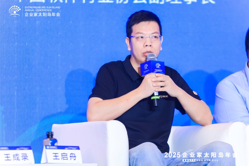 圖為杭州宇樹科技股份有限公司副總經理王啟舟在2025企業家太陽島年會主論壇思客對話環節進行發言。