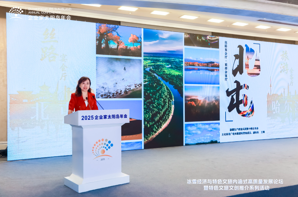 8月2日,2025太陽島企業家年會“冰雪賦能發展 文旅創引未來”冰雪經濟與特色文旅內涵式高質量發展論壇在哈爾濱舉行。圖為北屯市文化體育廣電和旅游局王梅作北屯市文旅城市推介