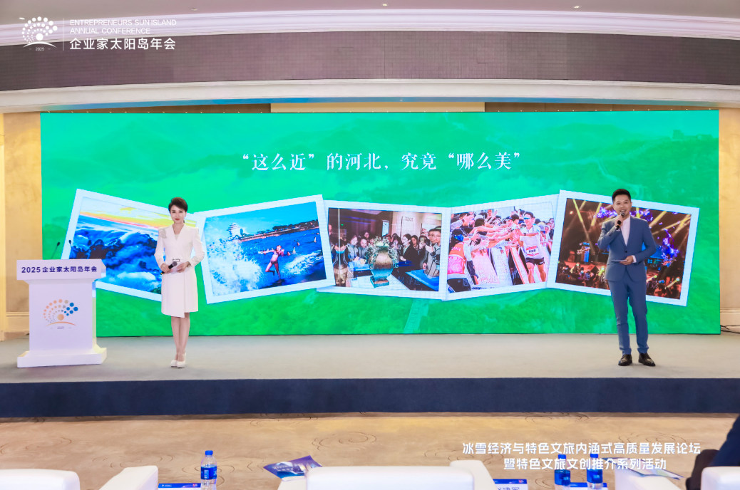8月2日,2025太陽島企業家年會“冰雪賦能發展 文旅創引未來”冰雪經濟與特色文旅內涵式高質量發展論壇在哈爾濱舉行。圖為河北省廣播電視臺主持人樂彤、楊旭作河北省重點文旅城市推介