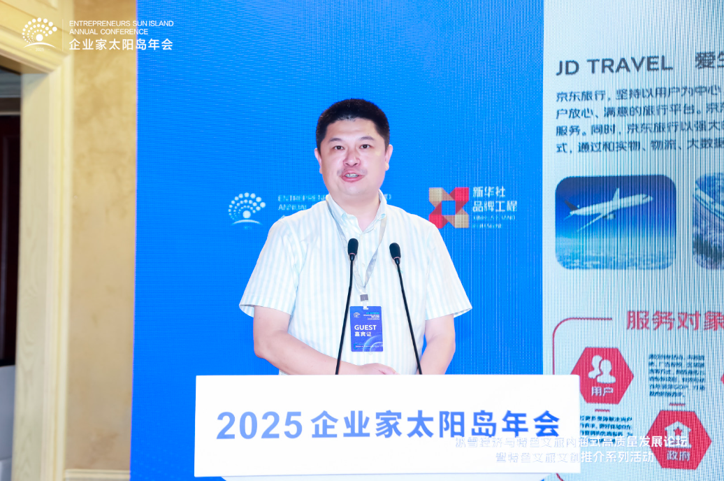 8月2日,2025太陽島企業家年會“冰雪賦能發展 文旅創引未來”冰雪經濟與特色文旅內涵式高質量發展論壇在哈爾濱舉行。圖為京東酒旅業務總經理張銳演講