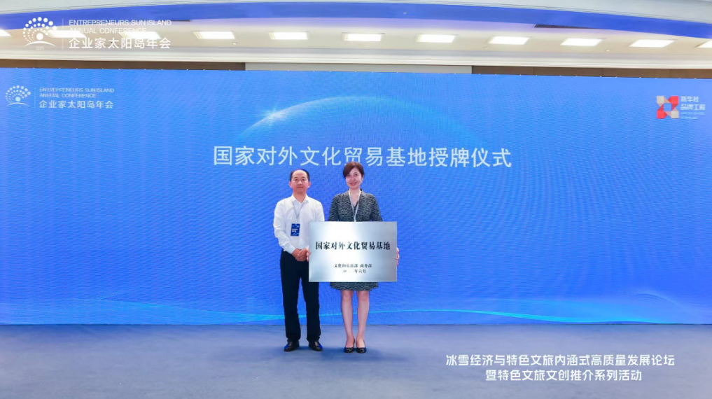 8月2日,2025太陽島企業家年會“冰雪賦能發展 文旅創引未來”冰雪經濟與特色文旅內涵式高質量發展論壇在哈爾濱舉行。圖為黑龍江省文化和旅游廳副廳長蔣興成為軒轅集團副董事長王輝授“國家對外文化貿易基地”牌