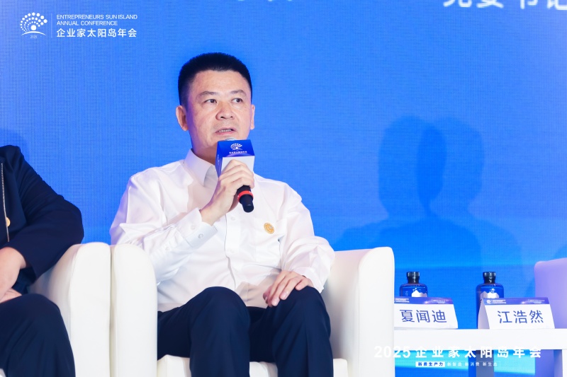 圖為中國機械國際合作股份有限公司黨委書記、董事長夏聞迪在2025企業家太陽島年會主論壇思客對話環節進行發言。