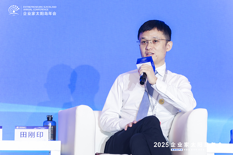圖為聯合飛機集團董事長田剛印8月3日上午在2025企業家太陽島年會主論壇思客對話環節參與討論。