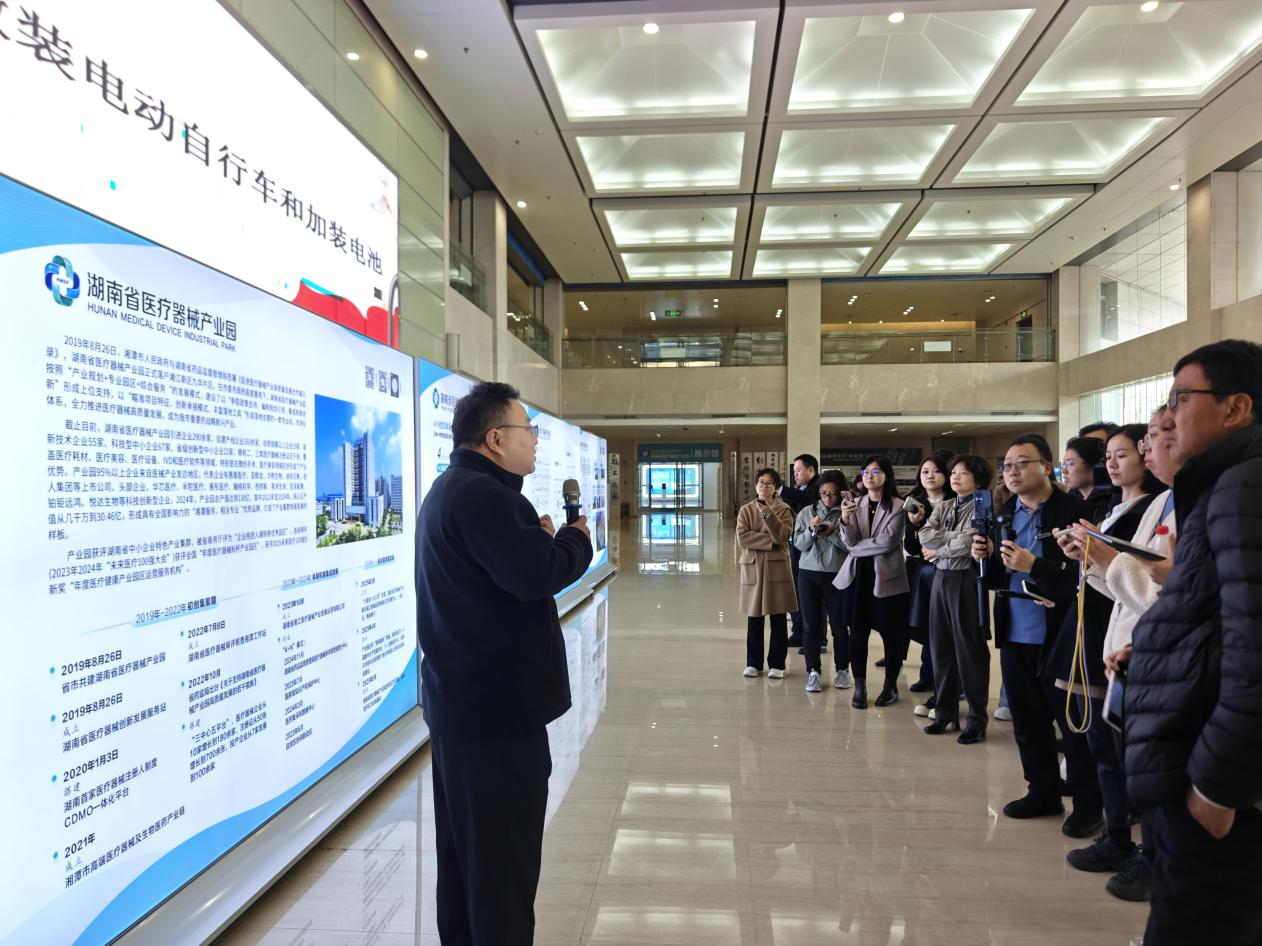 媒體調研團首先來到湖南省醫療器械產業園,產業園支部書記朱達介紹:“2019年8月,湘潭市人民政府與湖南省藥品監督管理局簽署合作備忘錄后,園區應運而生。園區按照‘產業規劃+專業園區+綜合服務’模式,堅持‘專業為本、創新至上’理念,依托‘省市共建、先行先試’持續探索改革。)湘潭經開區將其列為‘兩主一特’特色產業,六年來,園區實現了產值稅收飛輪增長?!?023年、2024年園區蟬聯“年度醫療器械標桿產業園區”,在國家經開區整體經濟穩步增長的背景下,今年1-10月產值達到32億元,同比增長29.7%,累計引進企業290余家,取證900余張,形成五大細分領域產業集聚。