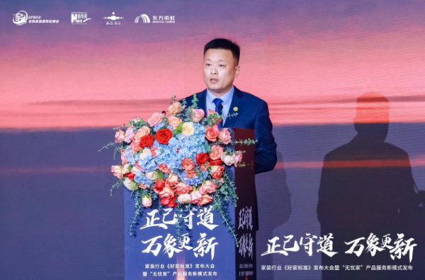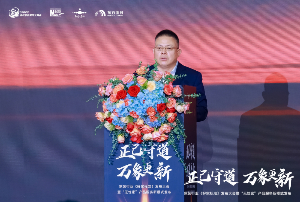 接下來,“無憂家”體系首席推薦官、東方雨虹民用建材集團副總裁熊衛鋒宣布了東方雨虹家裝戰略升級計劃,并重磅發布了全新的家裝產品體系與服務模式。