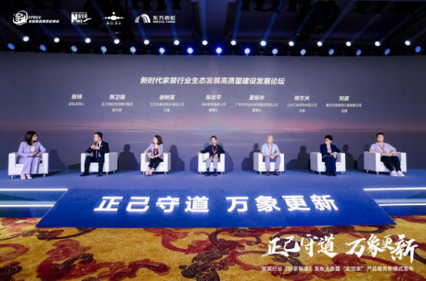 最后,大會進行了“家裝行業生態發展高質量建設發展論壇”,參與對話的嘉賓有:東方雨虹民用建材集團副總裁熊衛鋒、土巴兔集團股份有限公司總裁謝樹英、鴻揚家居有限公司董事長陳忠平、廣東華潯品味裝飾集團有限公司董事長夏振華、山東萬泰裝飾有限公司總裁柳方洲以及重慶兄弟裝飾工程有限公司總裁劉波。