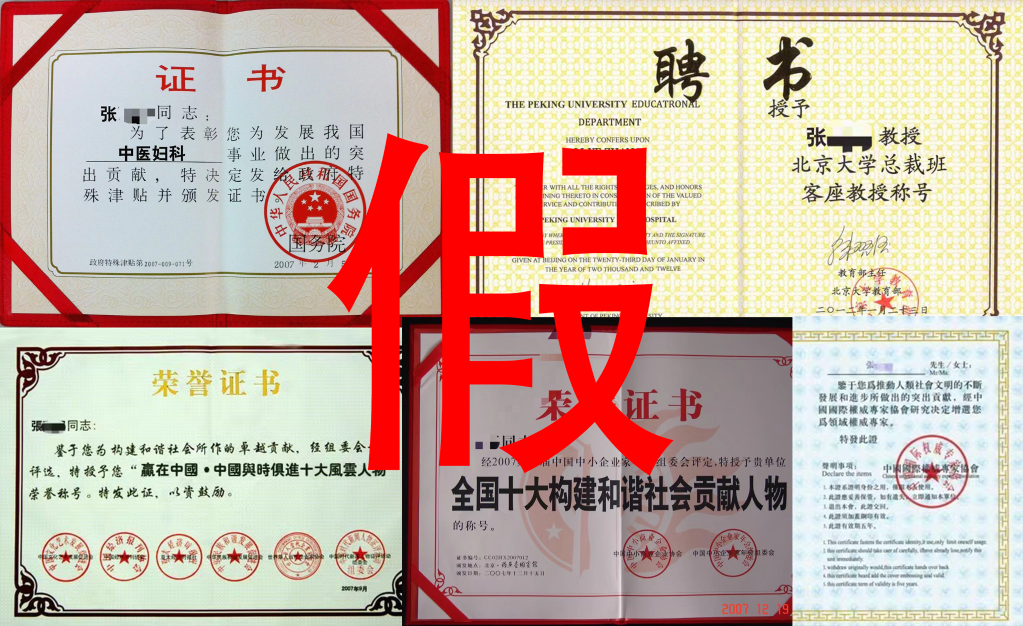 記者在警方展示的證據中看到,嫌疑人張某還偽造大量證書、虛構眾多頭銜騙取信任,如中醫婦科領域“權威專家證書”、“贏在中國·中國與時俱進十大風云人物”榮譽證書、“政府特殊津貼”證書、“北京大學總裁班客座教授”聘書等等。