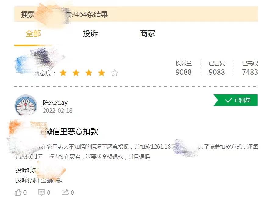 記者發現,在“黑貓投訴”平臺,該網絡保險平臺迄今已有9000多條投訴,“老人在不明白的情況下被誤導投?!钡瘸蔀槌R姷耐对V標題。