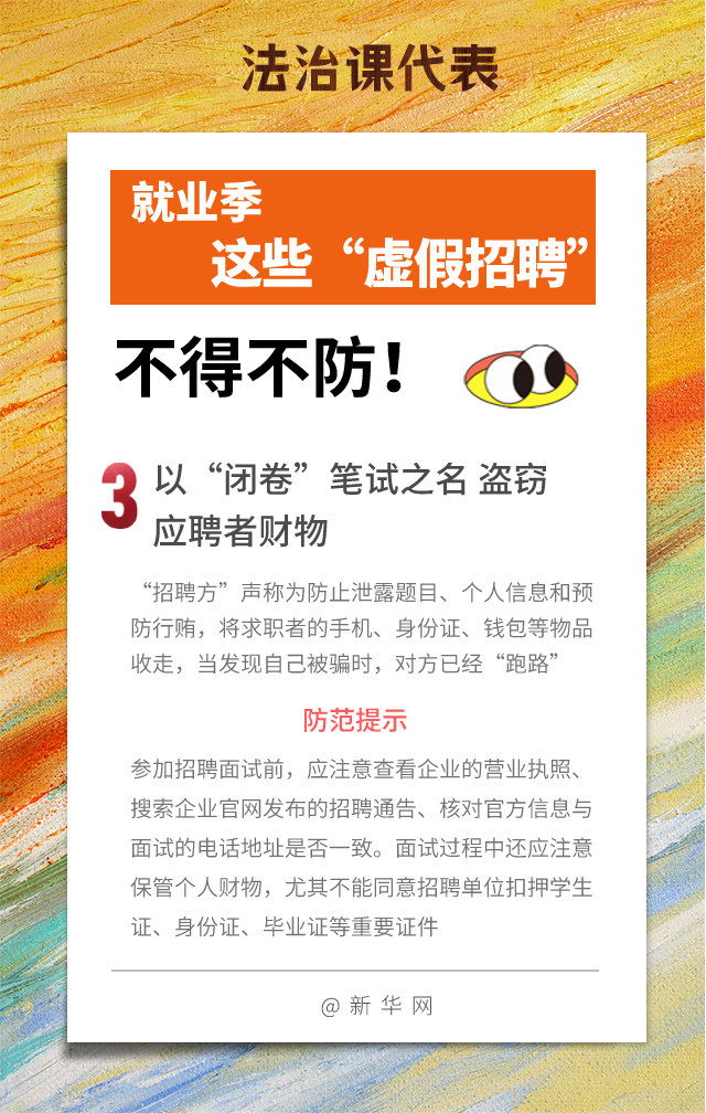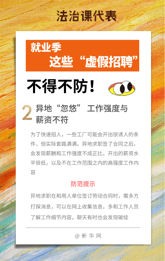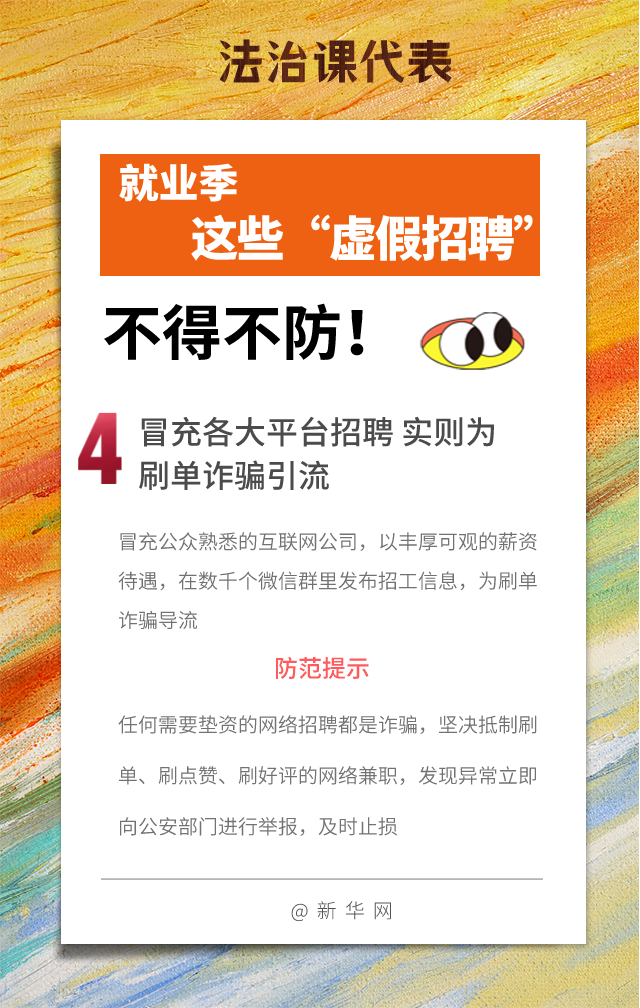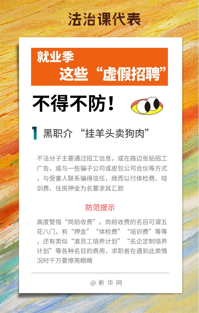 近日,人力資源和社會保障部會同國家市場監督管理總局發布通知,部署開展為期兩個月的清理整頓人力資源市場秩序專項行動,通知明確要以打擊虛假招聘等為重點。以下為幾種常見的“虛假招聘”套路,大家一定要注意防范!