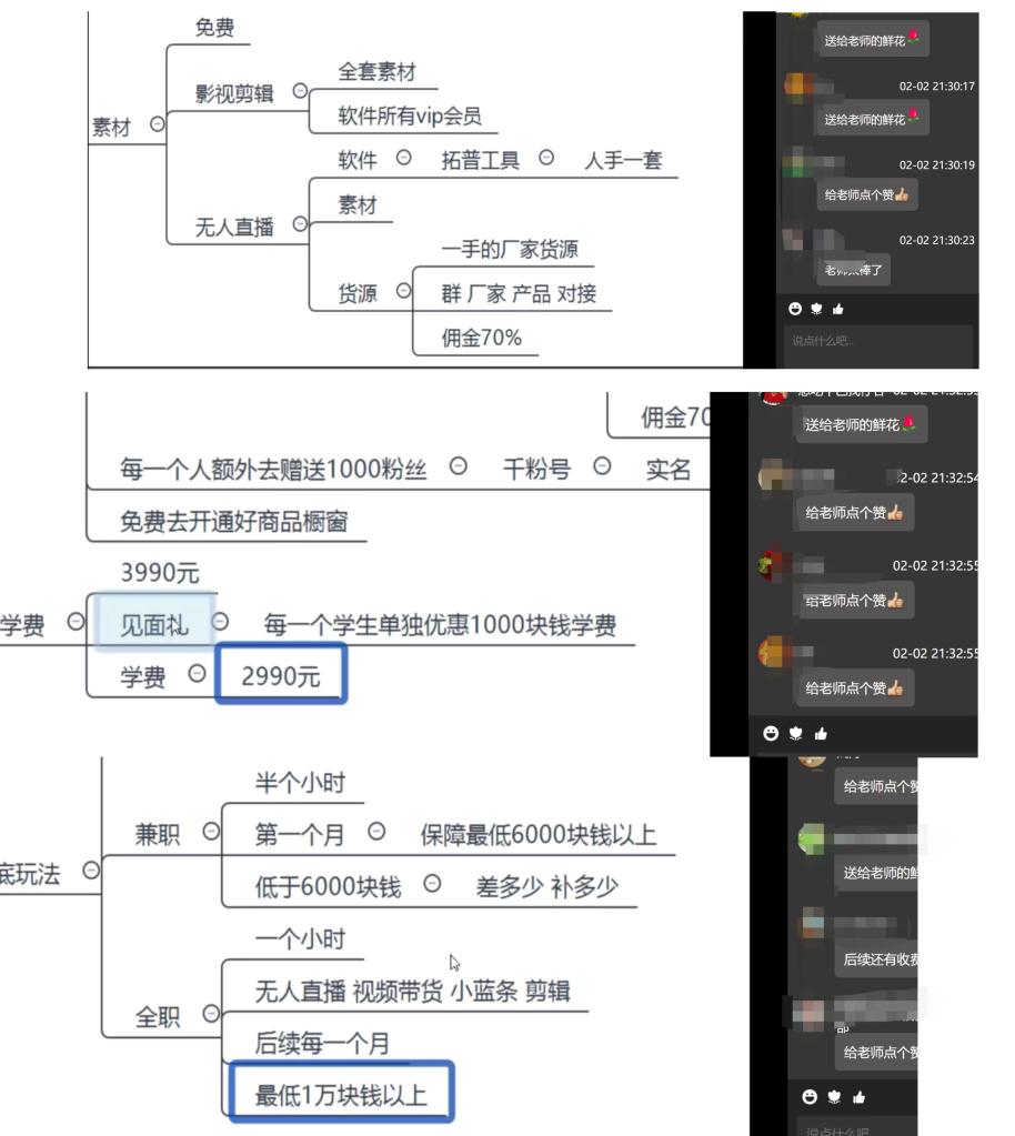 課程快結束時,該“講師”表示可為15位學員進行“一對一”授課,不僅能“手把手”教會各類變現技巧、免費贈送粉絲、對接帶貨貨源,還許諾如果學員全職從業,從第二個月起每月收入將不低于1萬元,但需要付課程費2990元。有部分學員付了款。
