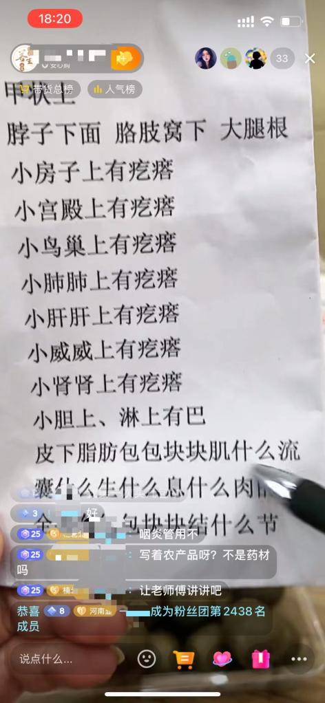 經過一段時間觀察后記者發現,主播提及的“囊什么腫”等“奇怪”的詞匯,實際上都是醫藥類術語:囊腫、息肉、結節、甲狀腺、湯藥等,之所以這樣說,目的是為了躲避平臺的違禁詞審查。