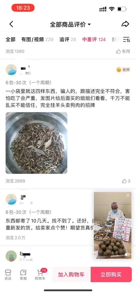 而在該款“散結湯”的詳情頁中,中差評達到數百條,有消費者寫道:“喝了一段時間,啥效果也沒有,病情嚴重的千萬別亂買”“在藥房里買同樣的東西,比這里便宜好幾倍”“打開一包,還混雜著一根生銹的釘子”……