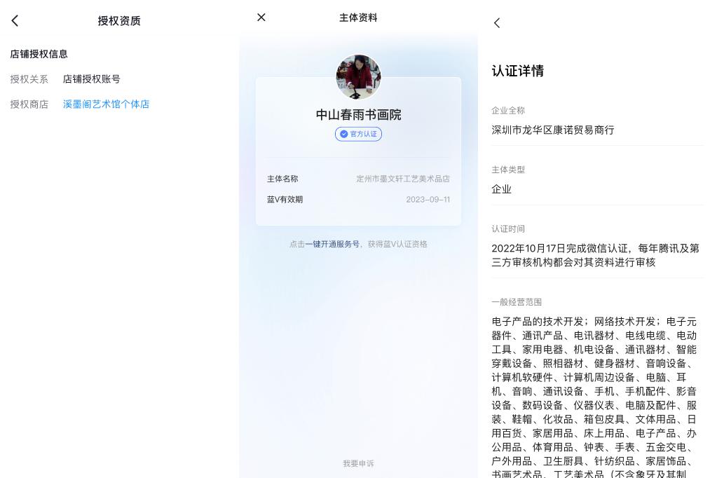 對此,許多消費者并不知情。記者隨后調查發現,這些具有“高大上”名字的直播間,經營資質多為個體工商戶或私人企業:“群英書畫”注冊信息顯示為“溪墨閣藝術館個體店授權賬號”;“睿云四?!憋@示為“深圳市龍華區康諾貿易商行”;“中山春雨書畫院”顯示為“定州市墨文軒工藝美術品店”……