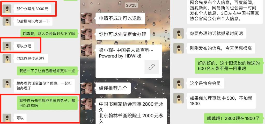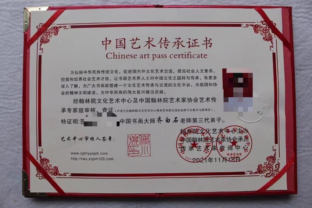 “你想辦理傳承嗎?”該工作人員繼續對記者介紹,只要3000元,還可以參加齊白石二代弟子線上課程,結業后就會收到“中國藝術傳承證書”,并被認定為“中國書畫大師齊白石再傳弟子”。對方向記者展示的證書顯示,經有關“專家組”審核、查證后,不少人已被認定為“齊白石第三代弟子”。而即使沒有任何相關資歷,也能成功入會?!拔覀兙褪菍I干這個的?!惫ぷ魅藛T說。