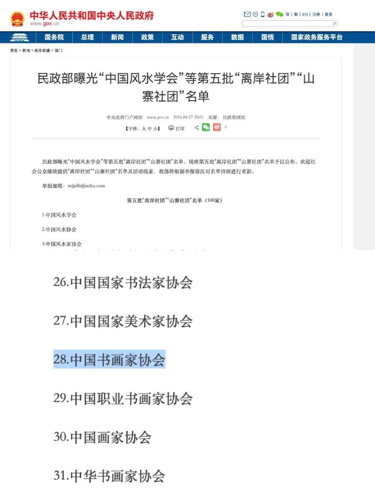 ↑“中國書畫家協會”早在2016年就被民政部列入第五批“離岸社團”“山寨社團”。(中國政府網截圖)