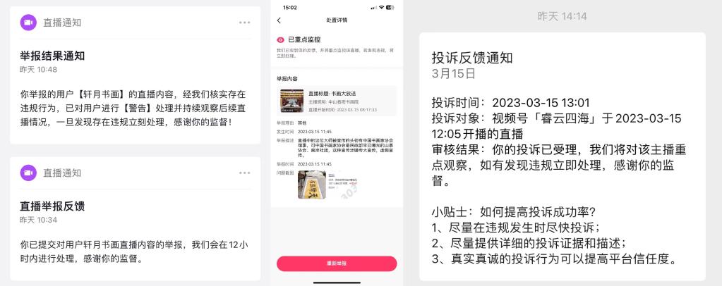 記者15日以涉嫌虛假宣傳、夸大宣傳為由,對上述直播間進行舉報,14分鐘后,抖音反饋稱對該直播間進行了警告處理,并持續觀察,“一旦發現存在違規立刻處理”。視頻號、快手也做出“重點監控”處理。但截至發稿時,有關直播平臺仍在正常直播中。