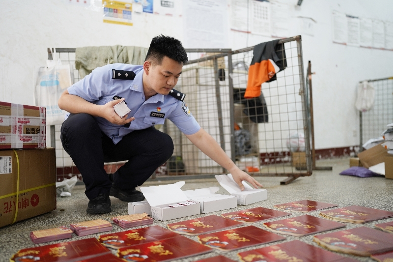 民警張洺銓正在清點用以詐騙的“蟹卡”。(廈門警方供圖)