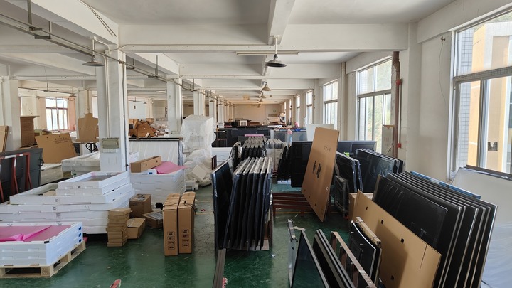專案組查處違法組裝電視機的車間時發現,庫房內堆積著大量電視機外殼、主板和白板顯示屏,還有很多品牌透明貼紙,以及部分準備發出和退回的假冒品牌電視機。