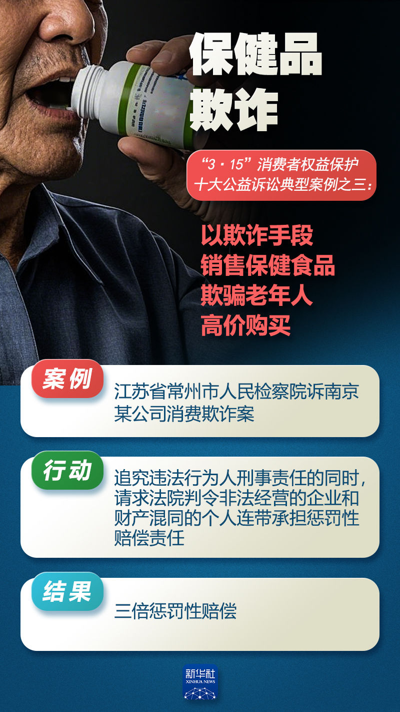 3月15日國際消費者權益保護日當天,最高人民檢察院聯合中國消費者協會首次發布消費者權益保護十大公益訴訟典型案例,涵蓋食品安全、個人信息保護、預付式消費等多個領域。公益訴訟案例的發布,體現了檢察機關與消費者權益保護組織聯合維護消費者合法權益,助力優化消費環境的努力。