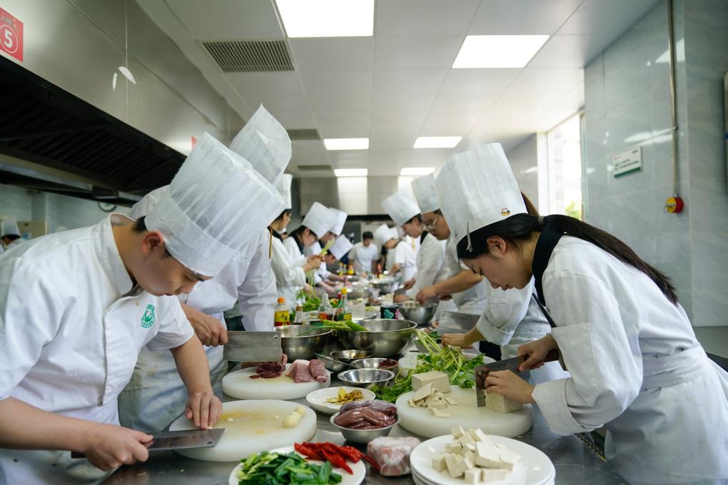 4月24日,在四川旅游學院,烹飪與營養教育專業學生在川菜制作工藝課上實操。新華社記者 胥冰潔 攝