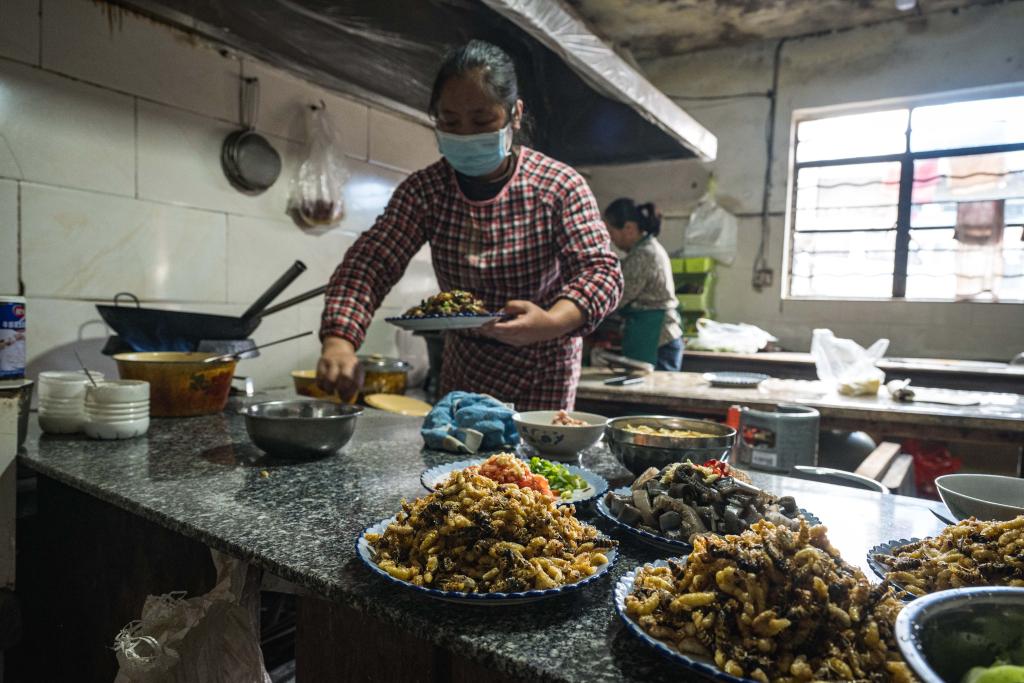 11月19日,云南省保山市龍陵縣龍山鎮一家餐館工作人員在制作菜品炸胡蜂蛹。