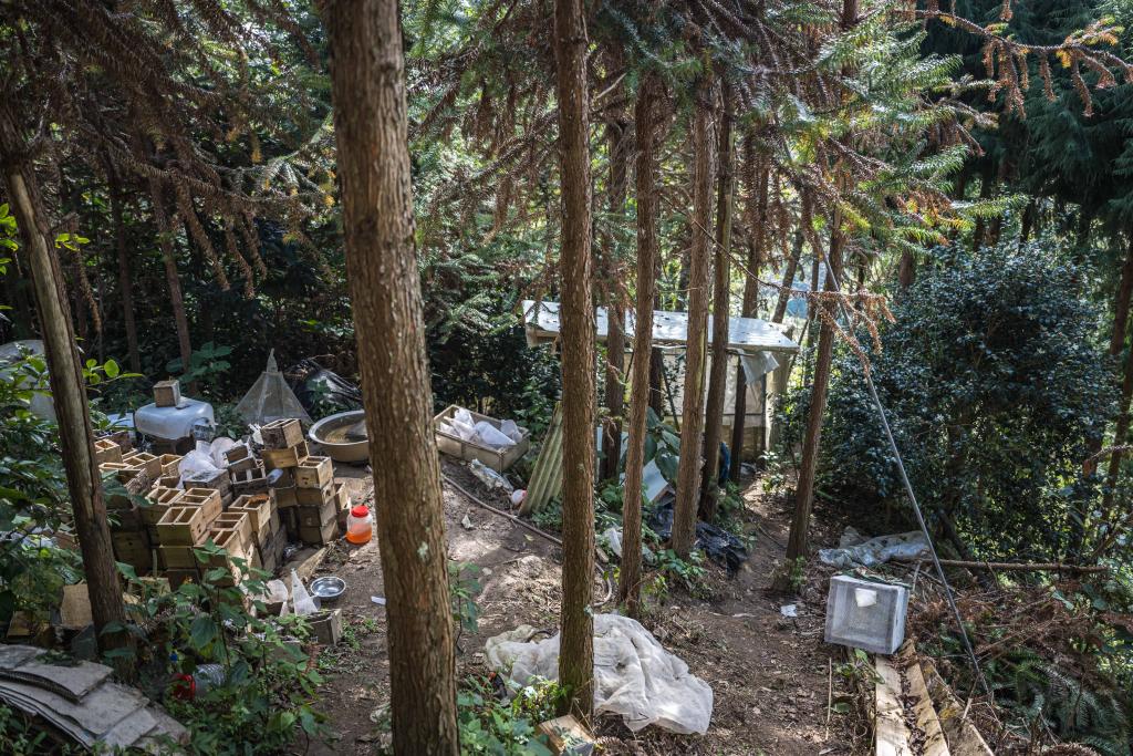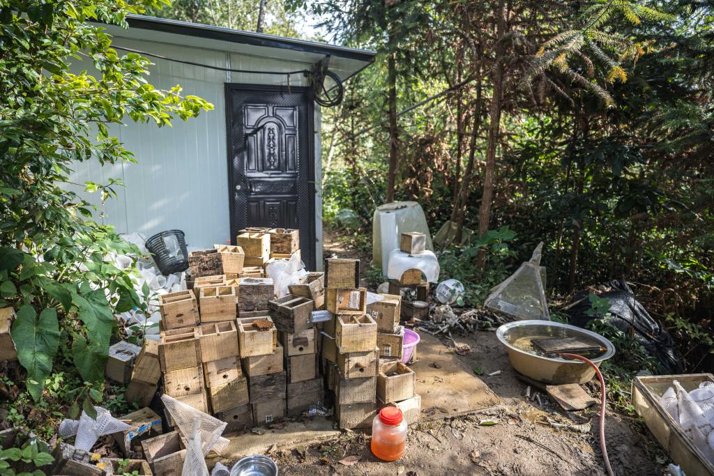 11月19日拍攝的云南省保山市龍陵縣龍山鎮河頭村,村中可見村民在家中、門外棚房養殖的胡蜂。