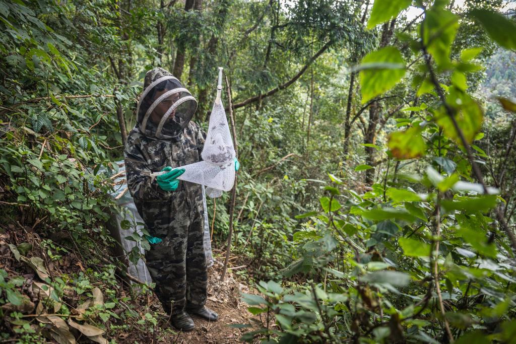 11月19日,在云南省保山市龍陵縣龍山鎮河頭村,村民給胡蜂喂蜂蜜水。