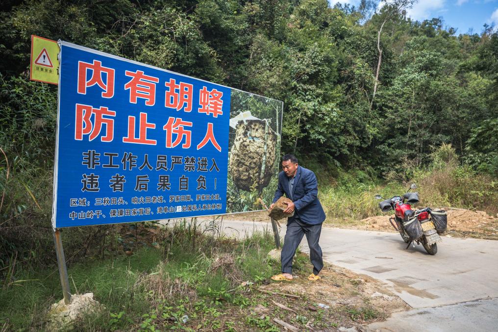 11月19日,在云南省保山市龍陵縣龍山鎮,龍陵縣黃氏蜂業有限公司工作人員在檢查警示牌。