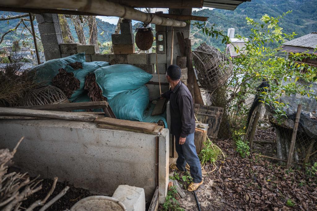 11月19日,在云南省保山市龍陵縣龍山鎮河頭村,一名村民查看野外收集的胡蜂。