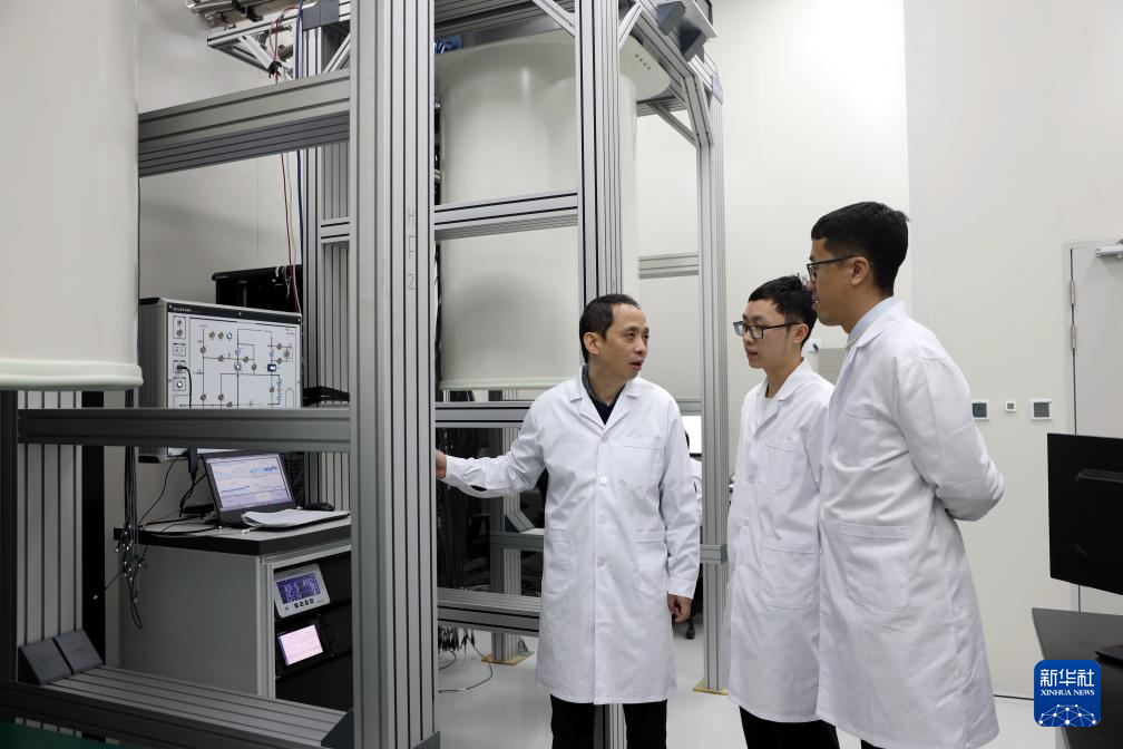 3月3日,中國科學技術大學教授、“祖沖之號”量子計算總師朱曉波(右)與學生討論制冷機狀態。新華社發(代蕊攝)