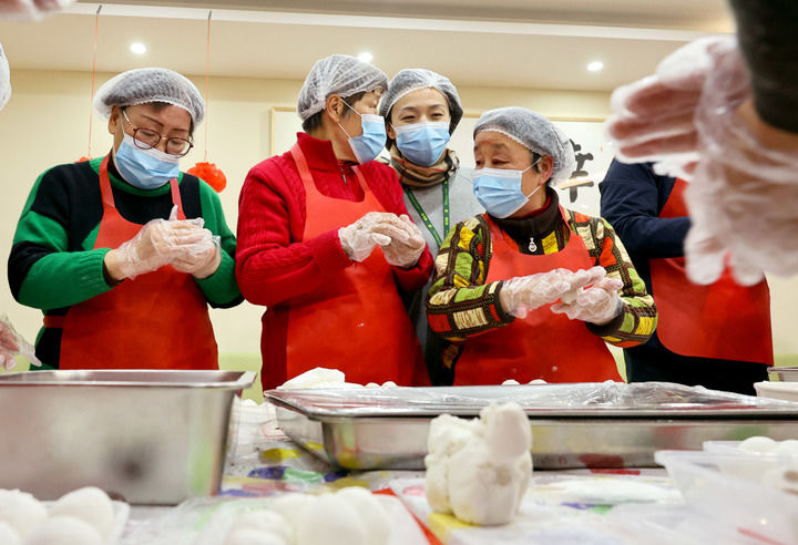 2月12日,社區居民在黃浦區老西門街道“廂遇85”社區長者食堂包湯圓,迎接元宵節。新華社記者 方喆 攝