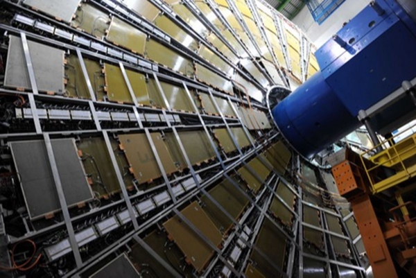 在瑞士日內瓦歐洲核子研究中心地下工作區拍攝的超環面探測器。(新華社)