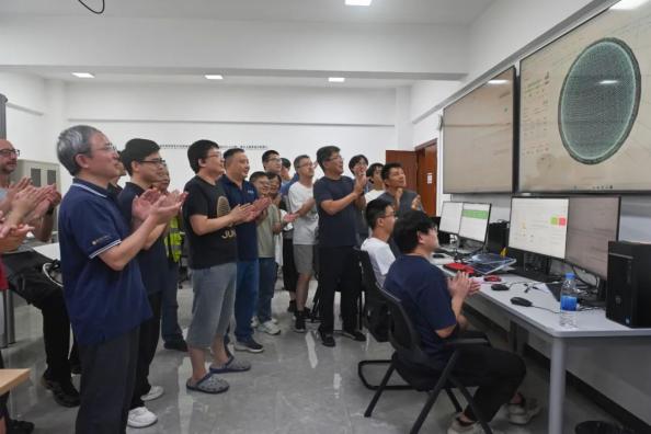 8月26日,科研人員在江門中微子實驗運行控制室共同開啟物理取數,鼓掌慶祝取數成功。新華社發(劉悅湘 攝)
