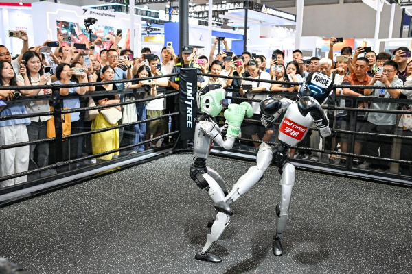在智博會N3展館,一個精心設置的小型“格斗場”被觀眾圍得水泄不通。兩臺宇樹科技的人形機器人拉開架勢,正在進行一場令人驚嘆的拳擊賽。它們拳來腳往,倒地后五秒之內就自主站立起身,動作麻利。