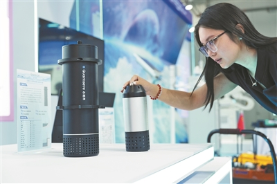 參觀者在看“水環境偵察兵”的地表水及排水管網監測終端。記者 洪星攝