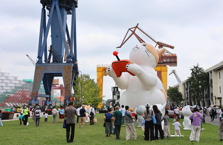 巨型塔吊下,一只近10米高的氣膜貓咪手持紅色遙控器仰頭望天,四只小貓環繞在側,仿佛在屏息圍觀這場跨越時空的“操控”……國慶中秋假期,不少旅客來到上海的新晉“頂流”復興島,藝術家Tango的裝置藝術作品《貓的頻道》吸引大家駐足打卡。