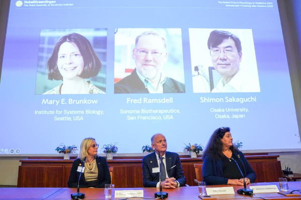 10月6日,在瑞典斯德哥爾摩舉行的2025年諾貝爾生理學或醫學獎公布現場,三名獲獎科學家的照片和名字顯示在大屏幕上。新華社記者 彭子洋 攝